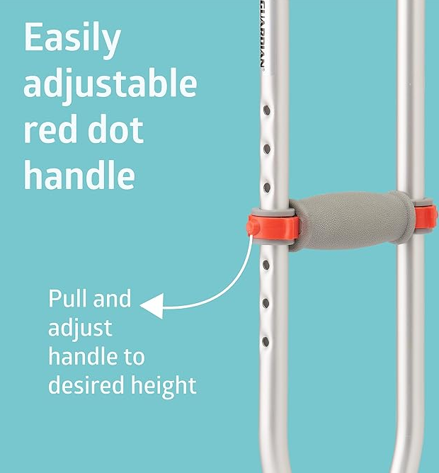 - ADJUSTABLE crutch height moves in 1-inch increments to accommodate adults & kids between 5’1”–5’9” tall. Red Dot handgrips also easily adjust to accommodate the user’s arm length.